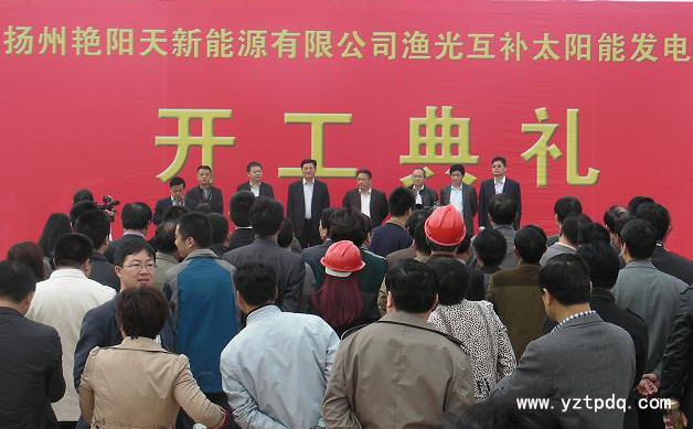 2014年4月18日,揚州艷陽天新能源有限公司漁光互補太陽能發(fā)電項目開工奠基儀式在寶應縣柳堡仁里蕩隆重舉行。寶應縣相關領導、上海新能源行業(yè)協會會長朱元昊、揚州艷陽天新能源有限公司負責人、柳堡各村(居)支部書記、各部門單位負責人、柳堡鎮(zhèn)機關全體干部等參加了開工奠基儀式。