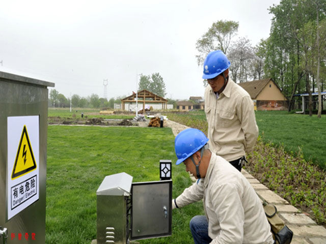 2019年4月26日,江蘇高郵市供電公司龍虬供電所員工在位于龍虬鎮(zhèn)北側(cè)的龍虬莊遺址公園檢查路燈控制箱。“五一”將至,擴建的龍虬莊遺址公園將于4月28日開門迎客,高郵市供電公司組織人員前往公園開展用電檢查,確保節(jié)日期間公園內(nèi)安全可靠用電。