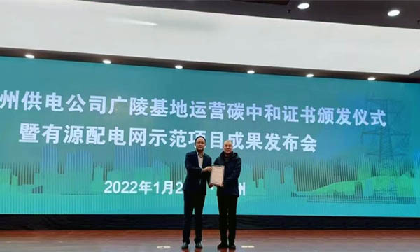 2021年11月,揚州供電公司委托中國國檢測試控股集團股份有限公司對廣陵基地進行了園區碳中和評價。審核結果表明,基地當月總碳排放量為153.60tCO2,與節能改造前同期數據相比,減少20.45%。同時,利用光伏抵消碳排放量為54.56tCO2,剩余通過購買并注銷經核證的國家自愿碳減排量完成抵消。“廣陵基地成為全省第一個獲得碳中和認證的非工業園區。”國檢集團揚州公司常務副總經理沈周介紹。