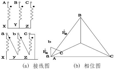 變壓器的極性標(biāo)注采用減極性標(biāo)注。減極性標(biāo)注是將同一鐵心柱上的兩個(gè)繞組在某個(gè)瞬間相對高電位點(diǎn)或相對低電位點(diǎn)稱為同極性,標(biāo)以同名端“A”、“a”或“·”.采用減極性標(biāo)注后,當(dāng)電流從原繞組“A”流入,副繞組電流則由“a”流出。變壓器的接線組別是三相權(quán)繞組變壓器原,副邊對應(yīng)的線電壓之間的相位關(guān)系,采用時(shí)鐘表示法。分針代表原邊線電壓相量,并且將分外固定指向12上,時(shí)針代表對應(yīng)的副邊線電壓相量,指向幾點(diǎn)即為幾點(diǎn)鐘接線。