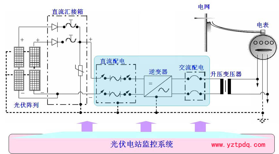 光伏并網發電系統是由光伏組件(方陣),光伏并網逆變電源,防雷匯流箱,交直流防雷配電柜及光伏電站運行監控系統組成。