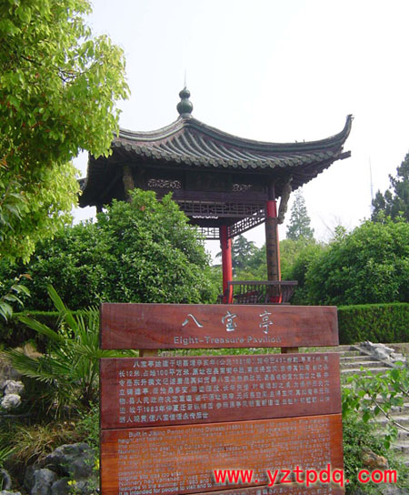 至明朝得寶河淤塞,真如寺傾頹。嘉靖三十年(1551)縣令岳東升見其地云氣殊常,五彩繽紛,命浚得寶河,作記刻碑,建亭護之,名“八寶亭“。此亭位于縣南街,清代曾兩次重修。1982年,年久失修的八寶亭被拆除,遷建于縱棹園中,趙樸初題額。八寶亭象征著寶應(yīng)得名的由來,朝暉夕陽映其雄姿,風(fēng)花雪月寄其詩情,它總是令人想起真如獻寶大唐轉(zhuǎn)危為安的神奇故事,已經(jīng)成為寶應(yīng)的標(biāo)志性建筑,令中外游客駐足瞻仰浮想聯(lián)翩。