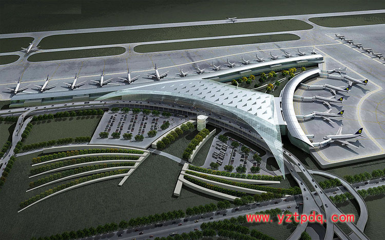 在機(jī)場航站樓效果圖上,作者發(fā)現(xiàn)航站樓平面形狀為扇形,地上二層,屋面為雙螺旋曲面構(gòu)造體系。據(jù)介紹,機(jī)場航站樓由美國蘭德隆與布朗有限公司設(shè)計(jì),建筑造型新穎,采用鋼結(jié)構(gòu)屋面,為斜交網(wǎng)格結(jié)構(gòu),具有三維動(dòng)感立體視覺效果。在機(jī)場航站樓前,是一個(gè)半月形的人工湖。“月光下的一彎‘藍(lán)月’,像一面明鏡特別迷人,體現(xiàn)出‘天下三分明月夜,二分無賴是揚(yáng)州’的月亮文化特色。”施工人員介紹說。