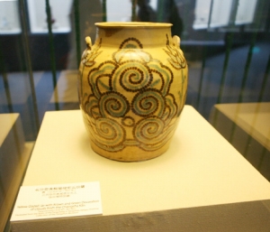 長沙窯黃釉褐綠彩云紋罐1974年在揚州唐城遺址出土,罐高29.8厘米,口徑16.3厘米,腹徑24.5厘米,底徑19.5厘米,罐直口,卷唇,高頸,鼓腹,平底。肩部置對稱扁環形雙系,系上飾云紋和“王”字。胎為米黃色,通體施青黃色釉,器身布滿紋飾,以褐、綠兩色相間的大小斑點組成聯珠狀卷云圖案,每組之間繪蓮葉和蓮花紋,具有濃郁的西亞風味。其形體之大,紋飾之精,釉色之美,是長沙窯罕見的珍品。