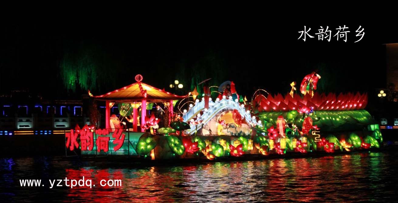 “水韻荷鄉”號花船由揚州拓普電氣科技有限公司所在地寶應縣承制的。寶應歷史悠久、人杰地靈,素有“寶地”美譽。整個花船以“生態、綠色”為主題,展現了“萬頃荷花別樣紅,捧出綠色也醉人,水鮮美食遠名揚”的寶應生態畫廊情景,更寓意著古寶應的靈氣,水寶應的秀氣,洋寶應的大氣。
