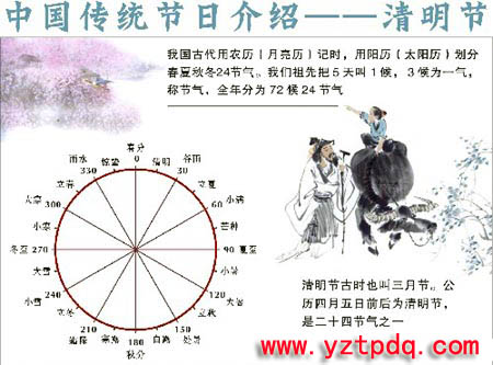 中華民族的傳統(tǒng)節(jié)日-清明節(jié)大約始于周代,已有二千五百多年的歷史。清明最開始是一個(gè)很重要的節(jié)氣,清明一到,氣溫升高,正是春耕春種的大好時(shí)節(jié),故有“清明前后,種瓜種豆”。“植樹造林,莫過清明”的農(nóng)諺。后來,由于清明與寒食的日子接近,而寒食是民間禁火掃墓的日子,漸漸的,寒食與清明就合二為一了,而寒食既成為清明的別稱,也變成為清明時(shí)節(jié)的一個(gè)習(xí)俗,清明之日不動煙火,只吃涼的食品。