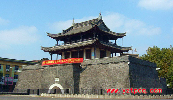 位于市區城河景觀帶,是儀征較為完整的古城遺址。建于明代成化23年(公元1487年),是儀揚歷史上漕運的交通要沖。樓體建在有拱門的通道的高臺基之上,面闊三間,兩層,層面鋪簡瓦,為帶徊廊的重檐九脊歇山頂式結構建筑。有碑記兩方,一方為嘉靖甲申年間(公元1542年)記載鼓樓被辟為關王祀祠的情況;一方為嘉靖44年間(公元1565年)記載倭寇侵犯我東南沿海的史實。樓南有“小秦淮”之稱的儀城河,登樓四望,城市風貌盡收眼底。