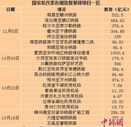 隨后在三季度經濟數據正式公布的次日,也就是10月22日,發改委批復了黔江至張家界至常德、商丘至合肥至杭州、鄭州至萬州3條鐵路項目,還批復了貴州仁懷、云南瀾滄、內蒙古扎蘭屯、青海果洛、吉林松原查干湖5個民用機場項目。數據顯示,3個鐵路項目總投資1445.16億元,5個機場項目總投資為54.9億元。