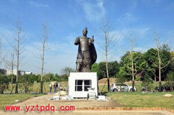 據(jù)施工人員介紹,吳王夫差雕塑設(shè)置在廣場東西中軸線的西端,材質(zhì)為青銅,基座高度約2.5m,雕塑高約6m,總體高度約8.8m。據(jù)工程負(fù)責(zé)同志介紹,吳王夫差雕塑今年5月13日確定了中標(biāo)供應(yīng)商,中標(biāo)供應(yīng)商在吸納評標(biāo)專家和部分揚(yáng)州文史專家的意見后,對雕塑的造型、服飾、面部神態(tài)等細(xì)節(jié)進(jìn)行了完善。據(jù)悉,這次先行吊裝的為1:1的玻璃鋼雕塑,重約1噸。為什么不直接吊裝青銅雕塑?專家告訴記者,這是想經(jīng)過一定時間的現(xiàn)場展示,來征集市民的意見,在征集市民意見截止之日起60天內(nèi),完成最終的青銅雕塑制作和現(xiàn)場安裝。