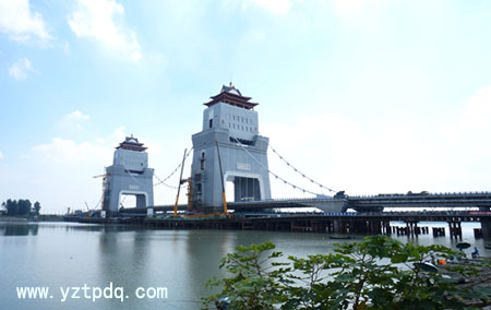 萬福大橋橫跨淮河入江水道主河道廖家溝,全長664米,主跨188米,是我國首座塔梁古建相結(jié)合景觀橋,也是揚州城市地標性建筑。主橋為雙塔自錨式懸索橋,橋型融現(xiàn)代美與古典美于一體,總體風(fēng)格為亭臺樓閣,設(shè)計獨特新穎,造型古樸典雅,與揚州城市歷史悠久、文化燦爛的厚重氣質(zhì)相得益彰。萬福大橋是我市一座觀光平臺。登上塔樓俯瞰,南面的長江和夾江,北面的邵伯湖和高郵湖,壯闊的江淮生態(tài)大走廊一覽無余;江都老城和揚州古城,廣陵新城和生態(tài)科技新城也都盡收眼底。如果天氣晴朗,長江對面的鎮(zhèn)江市的高山也可以看到。