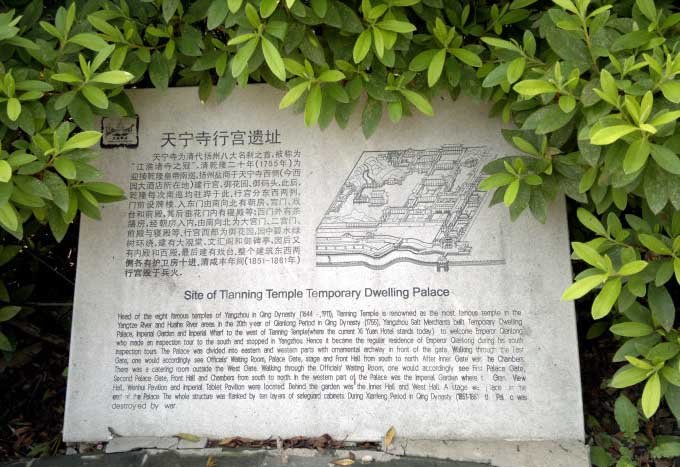 乾隆十八年,即公元1753年,揚州鹽商于天寧寺西園興建行宮,三年而成。宮前建御碼頭,乾隆游瘦西湖于此登船。御碼頭為青石所砌,歷經二百多年風雨,雖已經過修繕,仍完好無損,堅固如初。