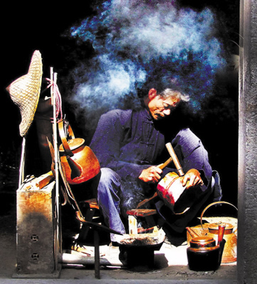 老揚(yáng)州人家都喜歡銅器,那時候,一般家庭所使用的器皿都離不開銅器,婚嫁時必備兩個銅盆,子孫滿月又要送個銅盆、一雙銅筷子,父母過六十大壽,子女照例會送上一個銅盆,寓意父母金盆洗手可以享清福了。以前揚(yáng)州一帶人家以擁有銅器為榮,使用銅器多的便是大戶人家。但到了“大躍進(jìn)”大煉鋼鐵時,人們紛紛把銅器捐了出來,銅器從此在日常生活中“淡出”,銅器鋪相繼關(guān)門,可銅匠擔(dān)仍然活躍在街頭巷尾。