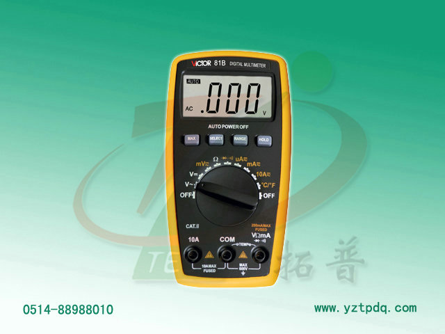 4、自恢復保險管保護電路設計; 基本功能 量程 VICTOR 81B 直流電壓 200mV/2V/20V/200V/600V ±(0.5%+4d) 交流電壓 200mV/2V/20V/200V/600V ±(0.8%+6d) 直流電流 200uA/2000uA/20mA/200mA/ ±(1.0%+10d) 交流電流 200uA/2000uA/20mA/200mA/ ±(1.5%+10d) 電阻 200Ω/2kΩ/20kΩ/200kΩ/2MΩ/20MΩ ±(0.8%+4d) 攝氏溫度 -20 ±(1.0%+5d) 華氏溫度 (0-1832)℉ ±(1.0%+5d) 特殊功能 二極管/通斷報警 √ 低電壓顯示 √ 數據保持 √ 自動關機 √ 功能保護 √ √ 防震保護 √ 單位符號顯示 √ 大值測量 √ 相對值測量 / 占空比測量 / 輸入阻抗 10MΩ 采樣速率 3次/秒 交流頻響 (40-400)Hz 顯示 3 1/2位(1999) 液晶尺寸 57× 電源 3V(1.5×2)